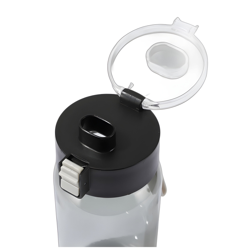 تعرض هذه الصور التفصيلية غطاء زجاجة ماء وفمها. يتميز الغطاء بتصميم قلاب مريح من الأعلى مع آلية قفل آمنة، مما يضمن أداء مانع للتسرب. هناك أيضًا حلقة حمل سهلة الاستخدام لسهولة الحمل. يتميز فم الزجاجة بتصميم أملس وواسع، مما يجعل من السهل ملؤها بالماء أو إضافة مكعبات الثلج، كما أنها سهلة التنظيف.