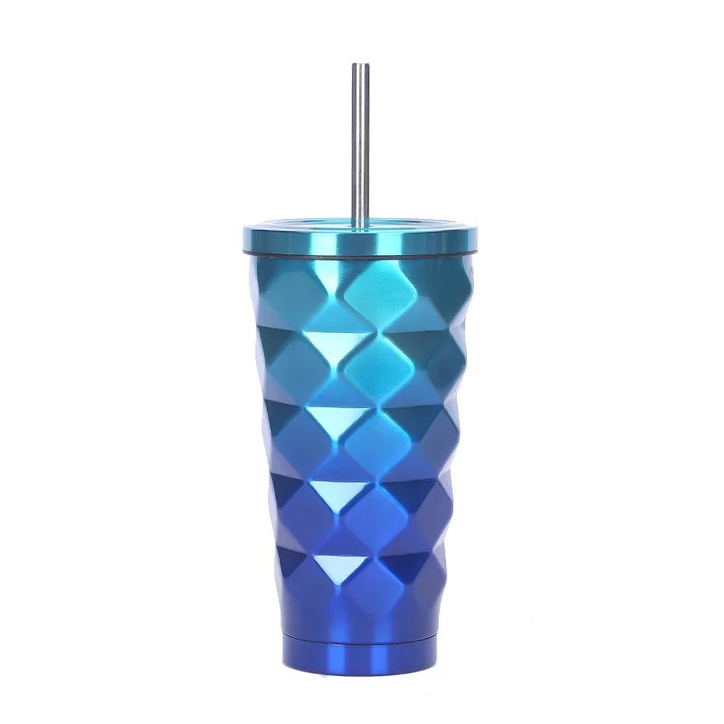 التصميم: يتميز الكوب بنمط ثلاثي الأبعاد على شكل ماسي يخلق ملمسًا يشبه الأناناس، مقترنًا بألوان متدرجة (مثل التدرجات البرتقالية الذهبية، والأزرق البنفسجي، والمتعددة الألوان، والذهبي الوردي)، مما يجعله عصريًا وملفتًا للنظر مع الجمع بين المظهر الفني والملمس.