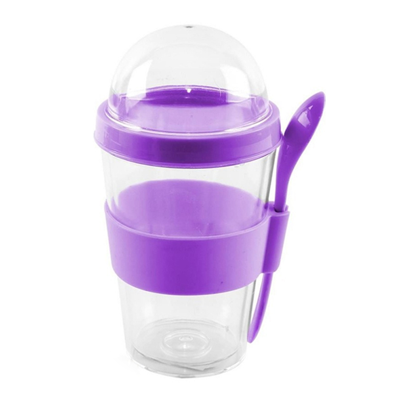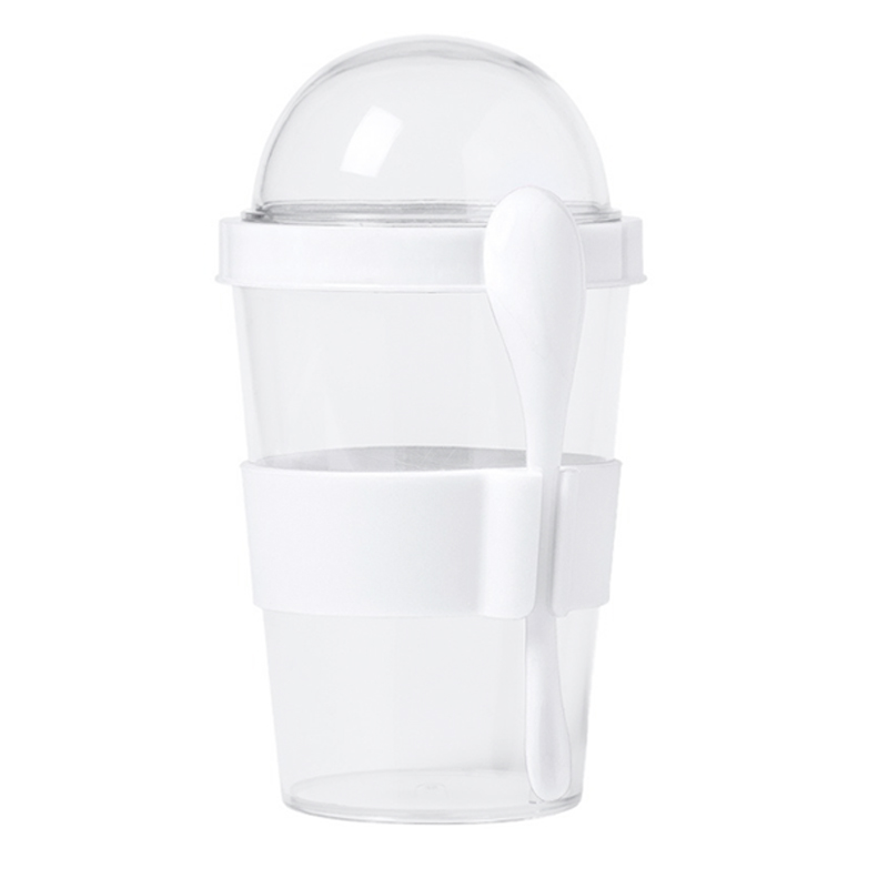 يمكن استخدام الغطاء على شكل قبة كمساحة منفصلة للجرانولا أو الحبوب أو الإضافات (بدون دقيق الشوفان المشبع!). املأ الكوب الرئيسي بالحليب أو الزبادي أو العصير، واحتفظ بالمكونات الجافة طازجة حتى تصبح جاهزًا للخلط، وهو مثالي للتنقلات أو صباح المكتب أو السفر.
