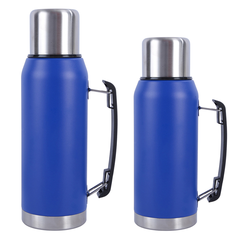 تُظهر هذه الصورة قارورة فراغ أزرق مع مقبض أسود. تم تصميم المقبض بشكل مريح ، مما يجعله مريحًا للقبض عليه. إنه مرتبط بقوة بجسم القارورة مع السحابات المعدنية ، مما يضمن المتانة والاستقرار أثناء الحمل.